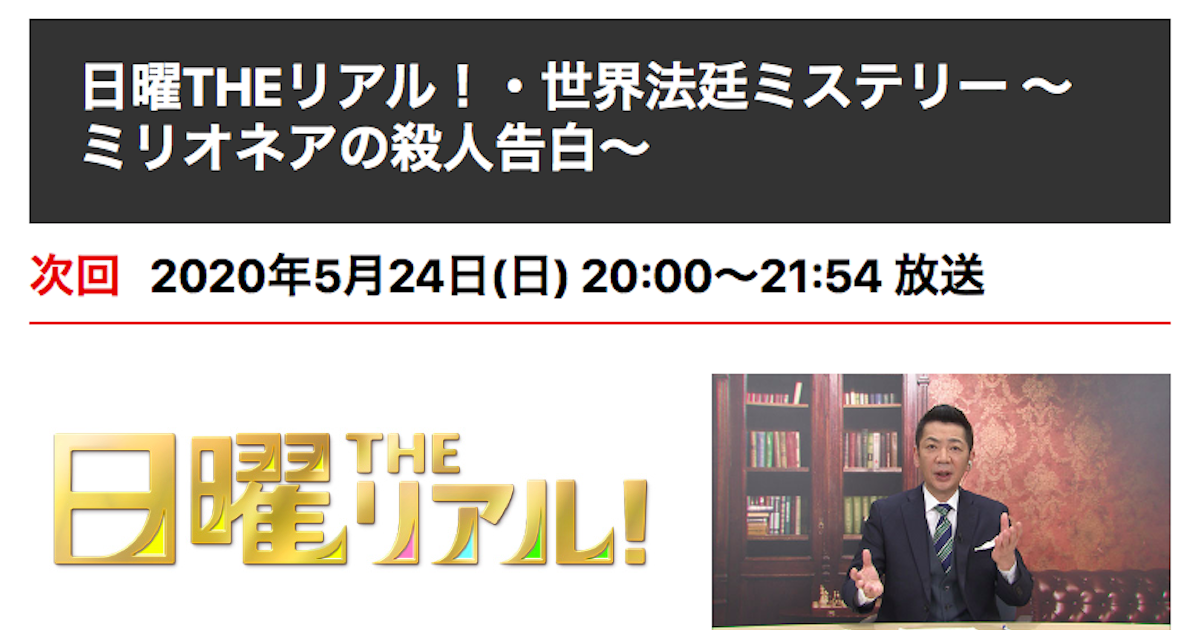 COLUMN2020.05.19 | Vol.94【メディア出演②】フジテレビ「日曜THEリアル!世界法廷ミステリー ミリオネアの殺人告白」に出演します